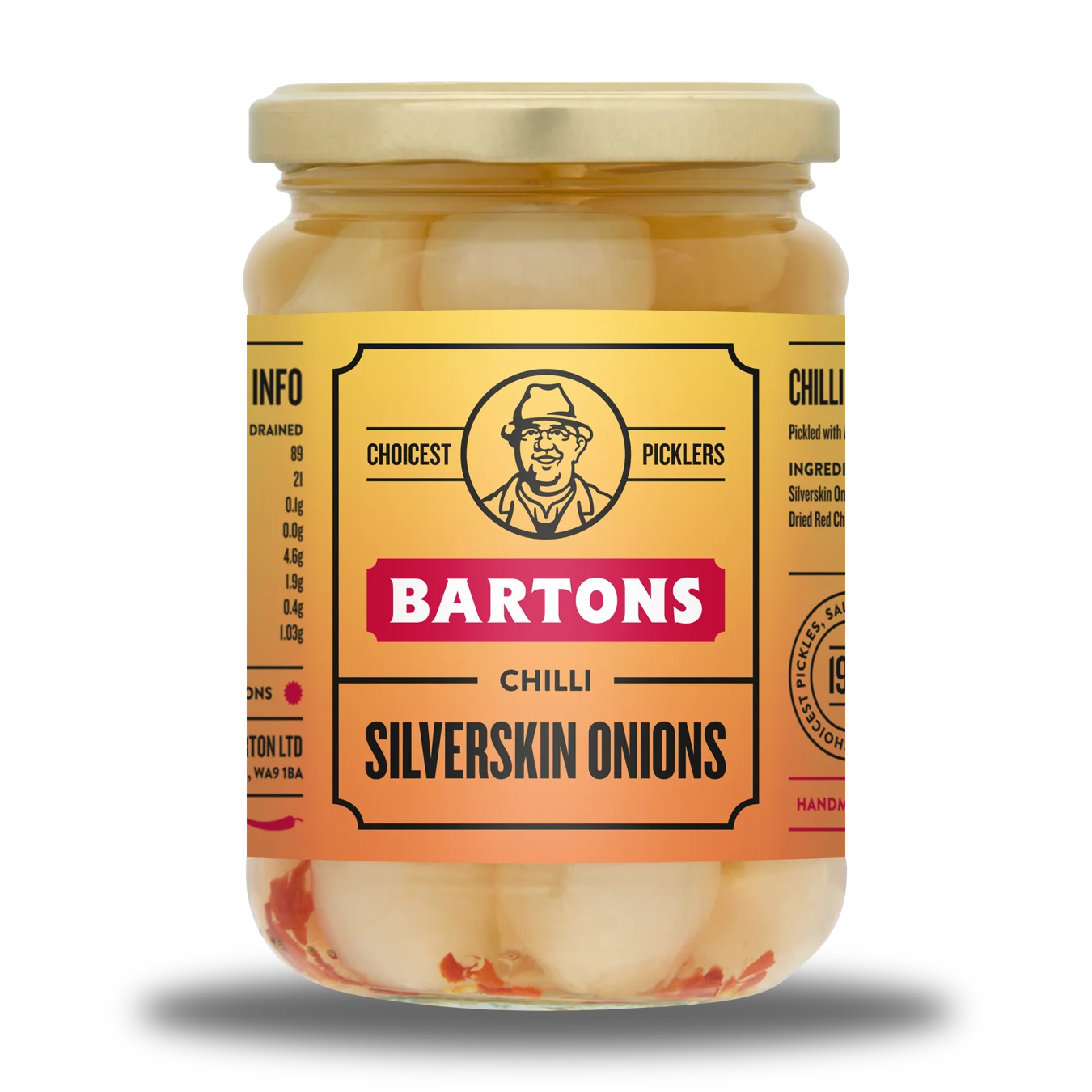 Silverskin Onions, Water, Acid (Acetic Acid), Spirit Vinegar, Salt, Dried Red Chilli, Glucose Syrup, Preservative (Sodium Metabisulphite).