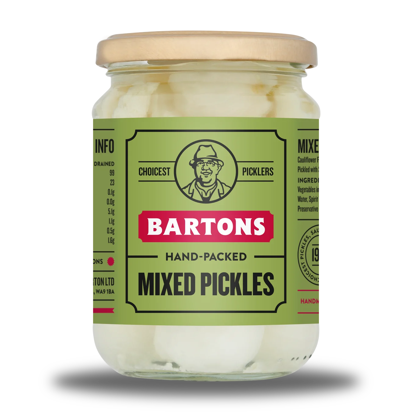 Bartons Mixed Pickled Onions in Vinegar is a pickle of onions, cauliflower and gherkin preserved with vinegar and salt.