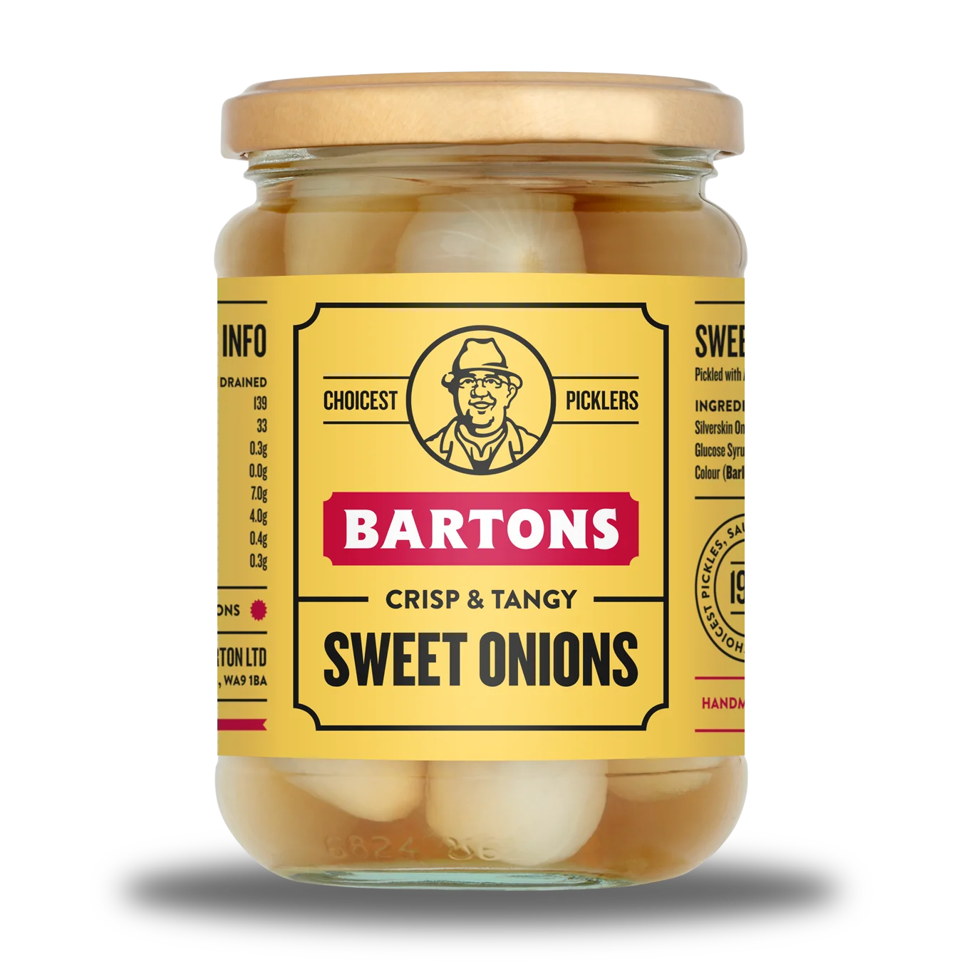 Bartons Sweet Onions in Vinegar is a pickle preserved with vinegar and salt. Eaten alongside Traditional English Fish and Chips or as part of a Pub ploughman’s lunch. These small white pickled onions are known as ‘silverskin’ onions, frequently used as an essential component of a salad or can be served on sticks and known as the ‘Party Onion’. They are also available in unsweetened vinegar.