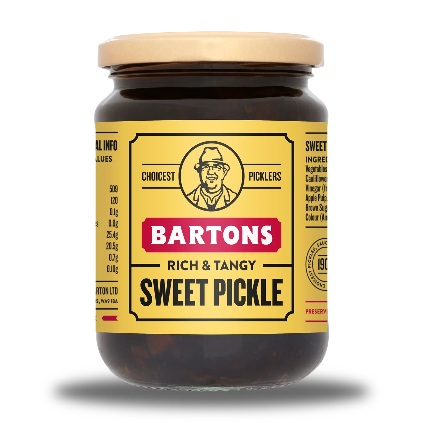 Bartons Sweet Pickle also called Ploughman’s Pickle or Chutney. It is made from a variety of diced vegetables, including onions, swede, carrots, onions, cauliflower and gherkins pickled in a delicious tangy sweet and spicy sauce made from vinegar, tomato, apple and dates with spices such as mustard, coriander, cinnamon, pepper, cloves, nutmeg to make a thick brown, sticky relish. It helps make the perfect cheese and pickle sandwich.